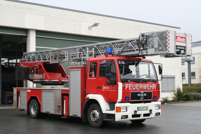 Die Drehleiter der Werkfeuerwehr Merck. Als Besonderheit führt der MAN 15.284 eine TS 8/8 von Rosenbauer mit. Deshalb ist dass vordere Gerätefach halbiert.