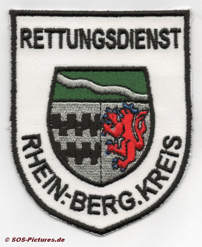 Ärmelabzeichen des Rettungsdienstes des Rheinisch-Bergischen-Kreises in schwarz auf weißem Stoff.