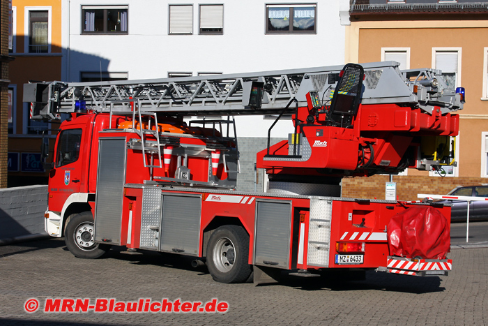 Drehleiter mit Korb (DLK-23/12) der freiwilligen Feuerwehr Bingen am Rhein.