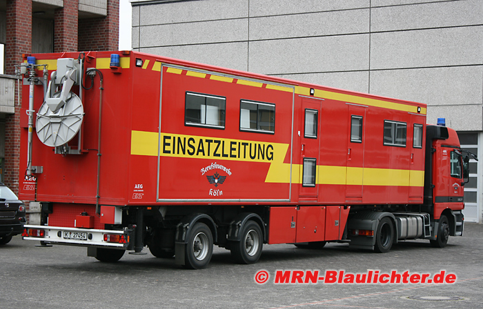 Mit der Beschaffung eines Sattelzug-Einsatzleitwagens ging die BF Köln 1999 völlig neue Wege und setzte Masstäbe in diesem Bereich. Der Auflieger läßt sich im hinteren Bereich hydraulich ausfahren. Somit hat der Stabsraum dann eine Breite von ca. 4,50 m.