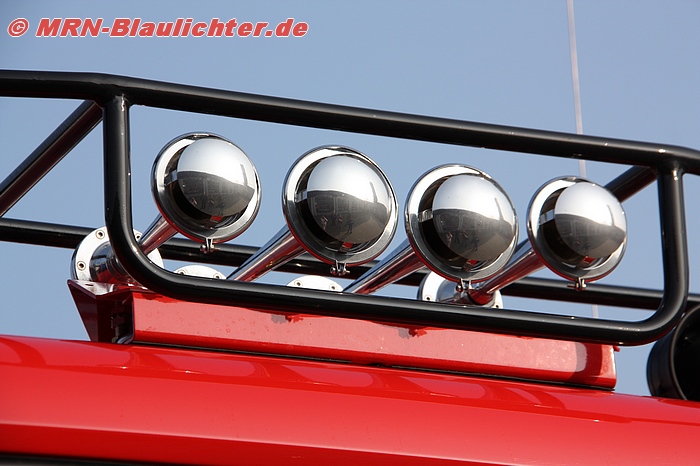 Sondersignalanlage: 2 Hänsch Nova, Martin-Pressluftfanfahren und Elektro-Horn WaGo WA-23, Hänsch Sputnic nano Frontblitzer, LED.Blitzer von Hänsch am Heck