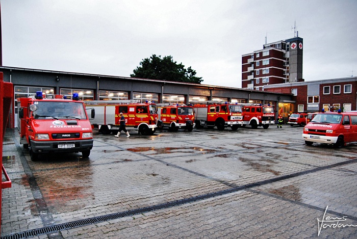 Gruppenaufnahme von Einsatzfahrzeugen der Heppenheimer Wehren nach einem Unwettereinsatz