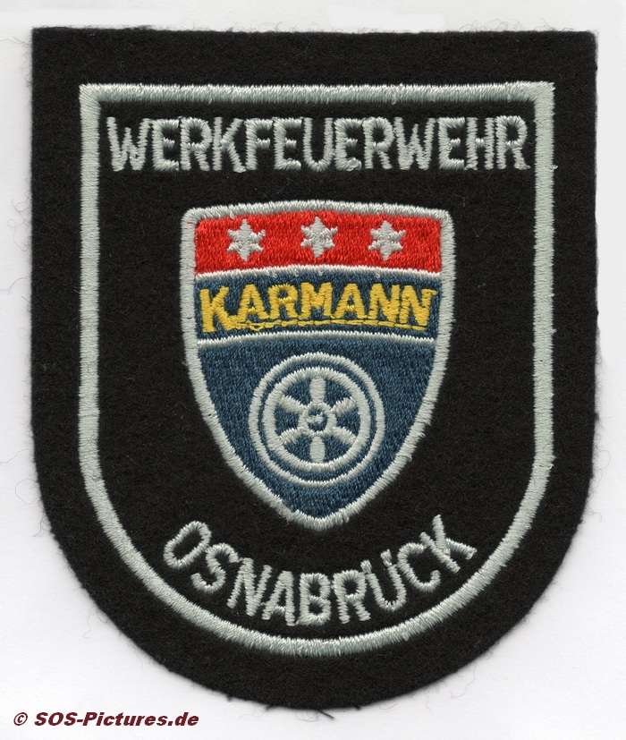 Ärmelabzeichen der Werkfeuerwehr Karmann GmbH Osnabrück in silber.