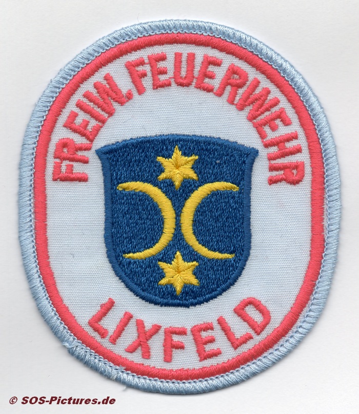 Ärmelabzeichen der FF Lixfeld in rot auf hellblauem Stoff.