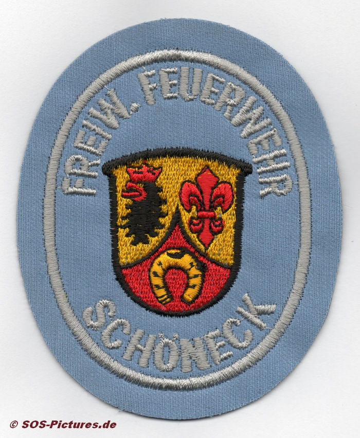 Ärmelabzeichen der FF Schöneck in silber auf hellblauem Stoff.