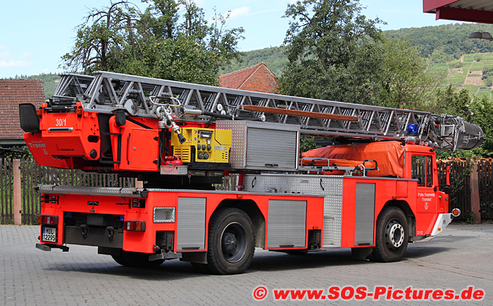 Drehleiter mit Korb in niederer Bauweise (DLK 23/12 n.B.) der Feuerwehr Trennfurt.