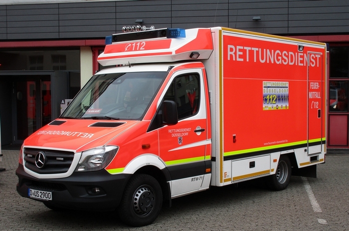 Rettungswagen (RTW) der Landeshauptstadt Düsseldorf, stationiert auf der Feuerwache 3 und Tagsüber besetzt durch die Besatzung der JUH.