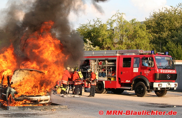 LF 16 der Feuerwehr Ladenburg bei einer PKW Brand Übung auf dem Löschplatz der Firma Total.