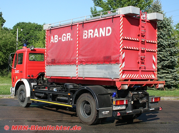 WLF (Wechselladerfahrzeug) der Feuerwehr Mannheim. Der Aufbau stammt von der Firma Attlas.
